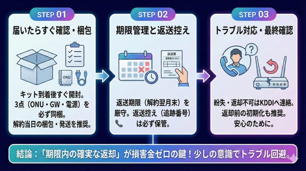 ここまで、auひかりの機器返却を忘れた場合の対処法や、返却時の注意点を解説してきました。 最後に、トラブルを防ぐためのチェックポイントを整理しておきましょう。
