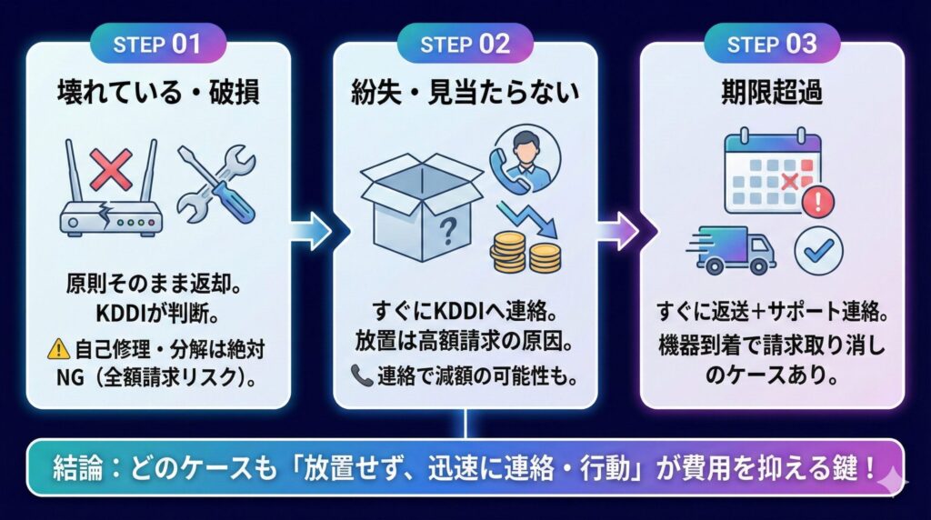 ✅ ポイント: 請求が確定する前に返却できれば、損害金を免除してもらえるケースもあります。 すでに期限が過ぎている場合は、KDDIサポートに「返却意志がある」と連絡しておきましょう。