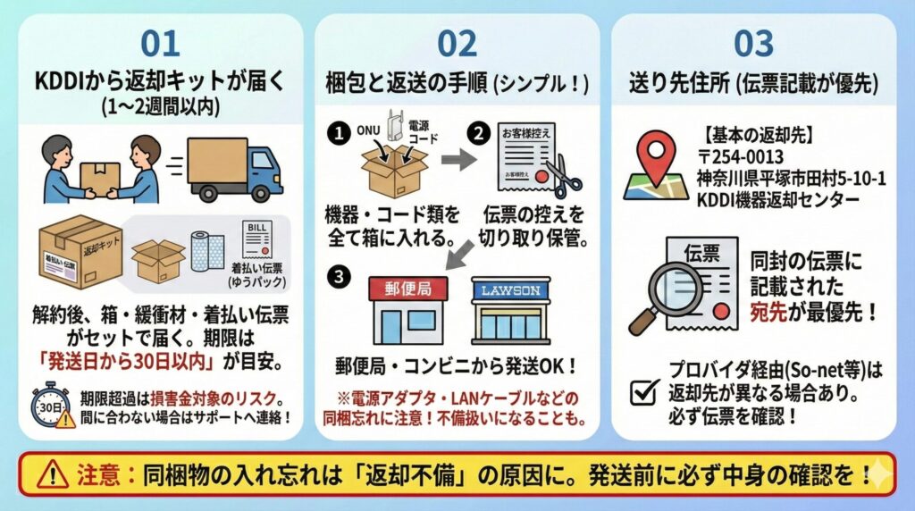 ✅ ポイント: KDDIから解約受付後に「返却キット(着払い伝票)」が届きます。 これを使えば無料で返送できるので、届いたらすぐに対応するのがベストです。