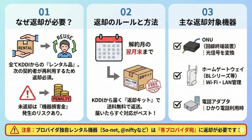 ⚠ 注意: 中には、プロバイダ(So-net、@niftyなど)経由でレンタルしている場合もあります。 その場合、KDDIではなく各プロバイダ宛に返却する必要があります。