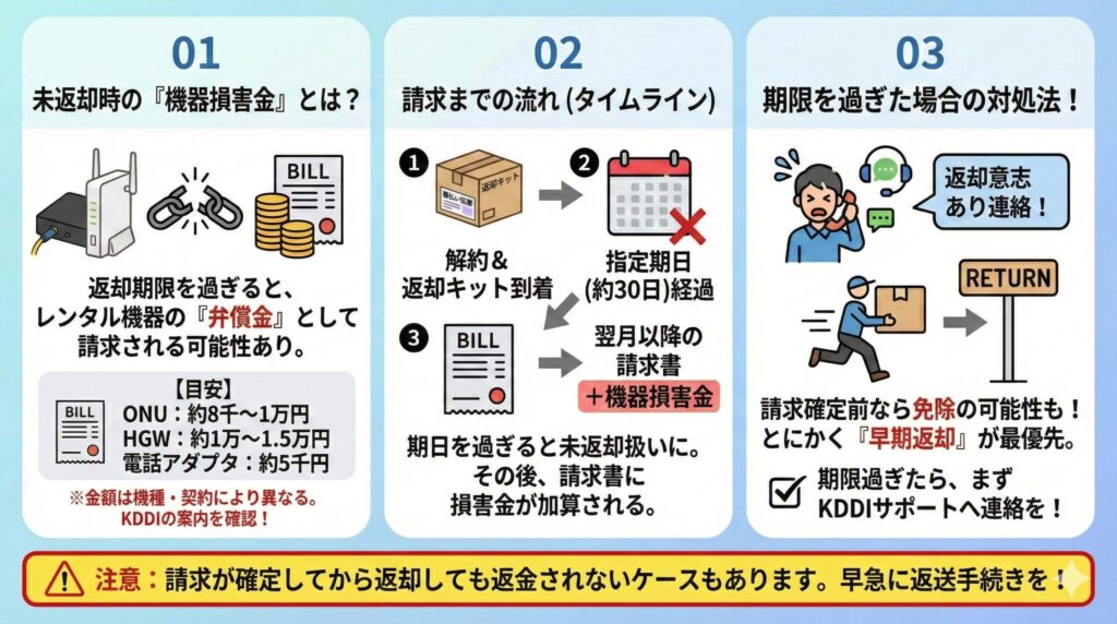 その場合は、KDDIから機器損害金(機器代相当額)が請求される可能性があるね。返却時期を過ぎているなら早めに対応しよう。