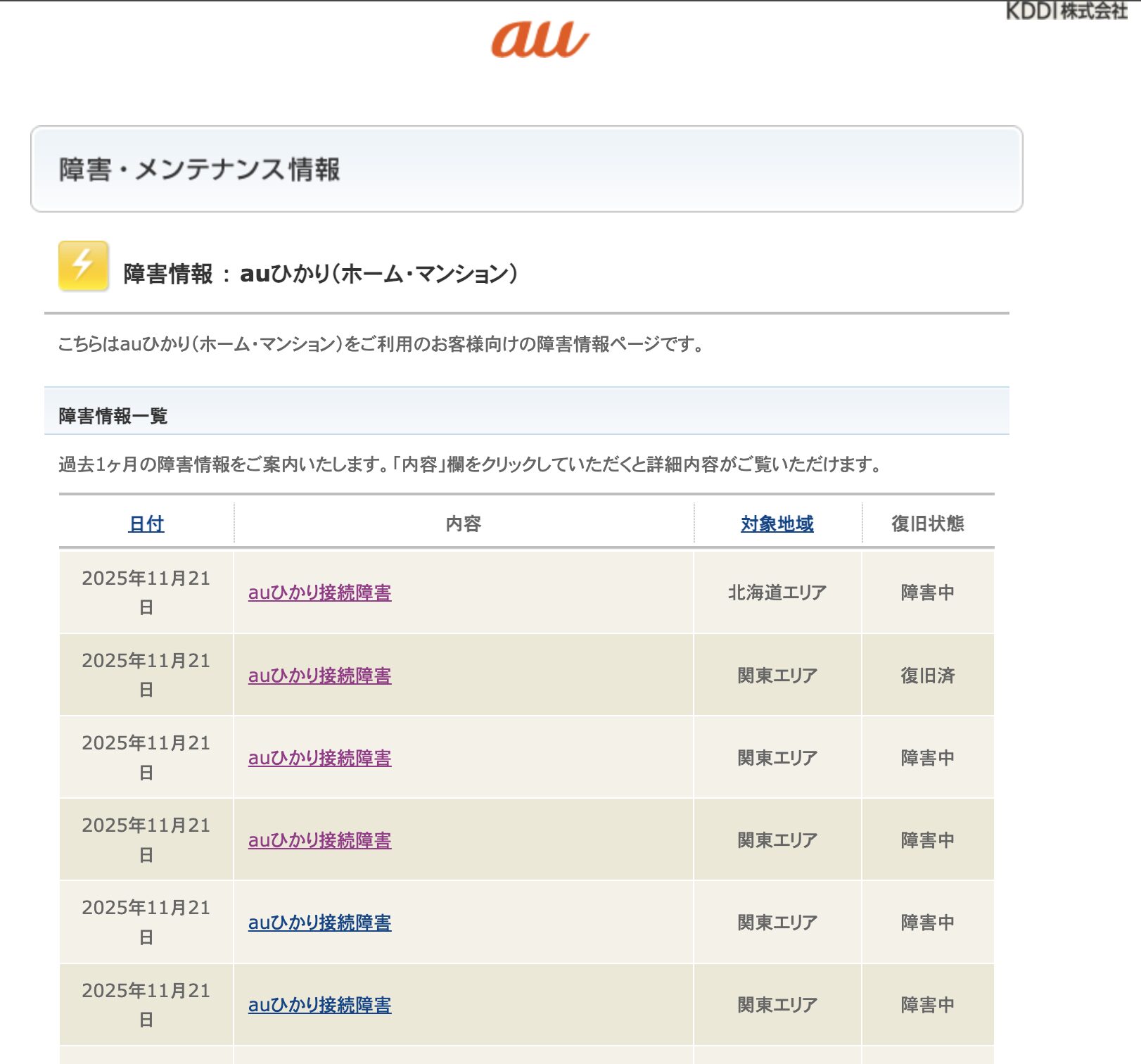 | auひかり サポートページ | https://www.au.com/support/service/internet/auhikari/ | 回線別・地域別に障害を絞り込み表示 |