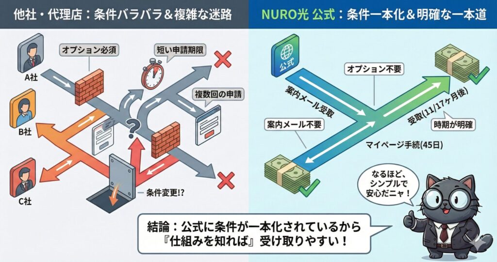 ⚠ 注意: 代理店独自特典は、NURO光公式のキャッシュバック条件とは別管理です。