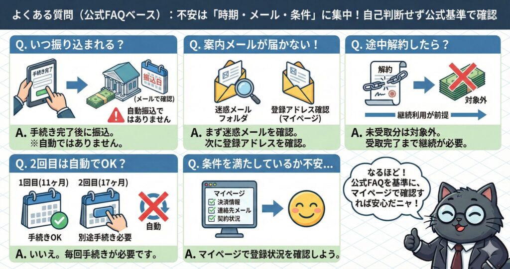 特に多いのは、「いつ振り込まれるのか」「メールが届かない場合はどうするのか」「条件を満たしているか不安」といった点です。