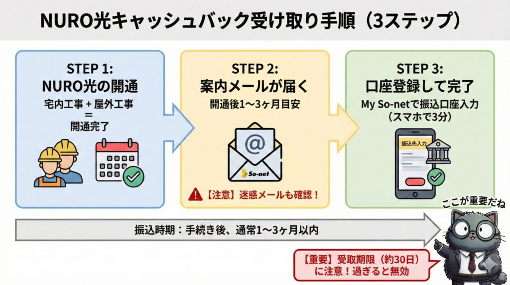 安心して大丈夫。NURO光の公式キャッシュバックは、開通後に届く案内メールから手続きするだけでOK。実質3ステップで完了するよ。