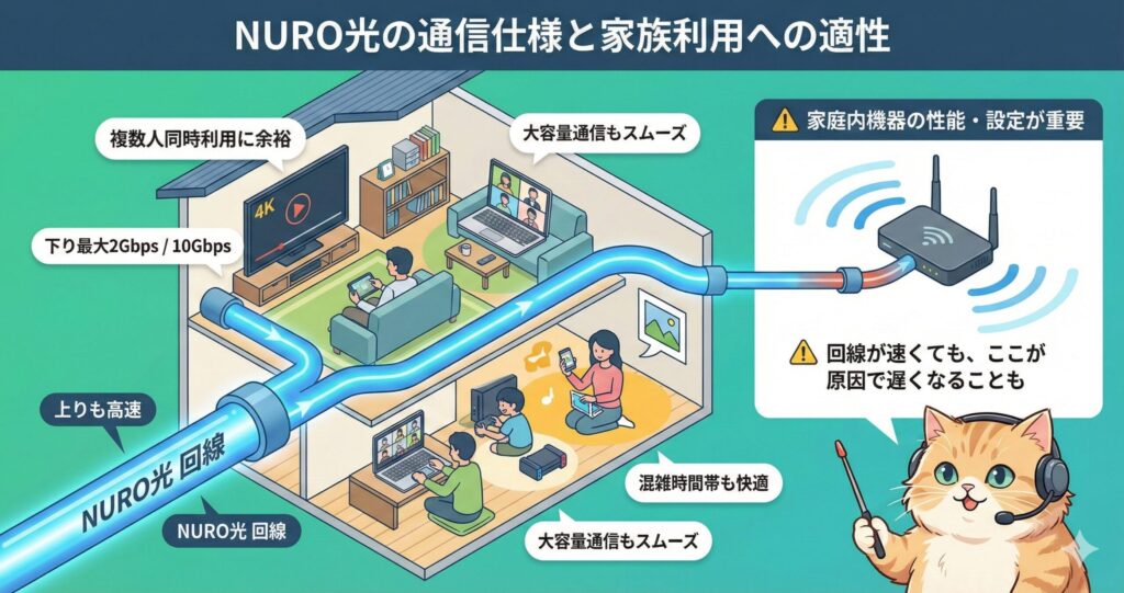 ポイント: NURO光は下り・上りの両方に余裕があり、複数人同時利用に向いた仕様になっている