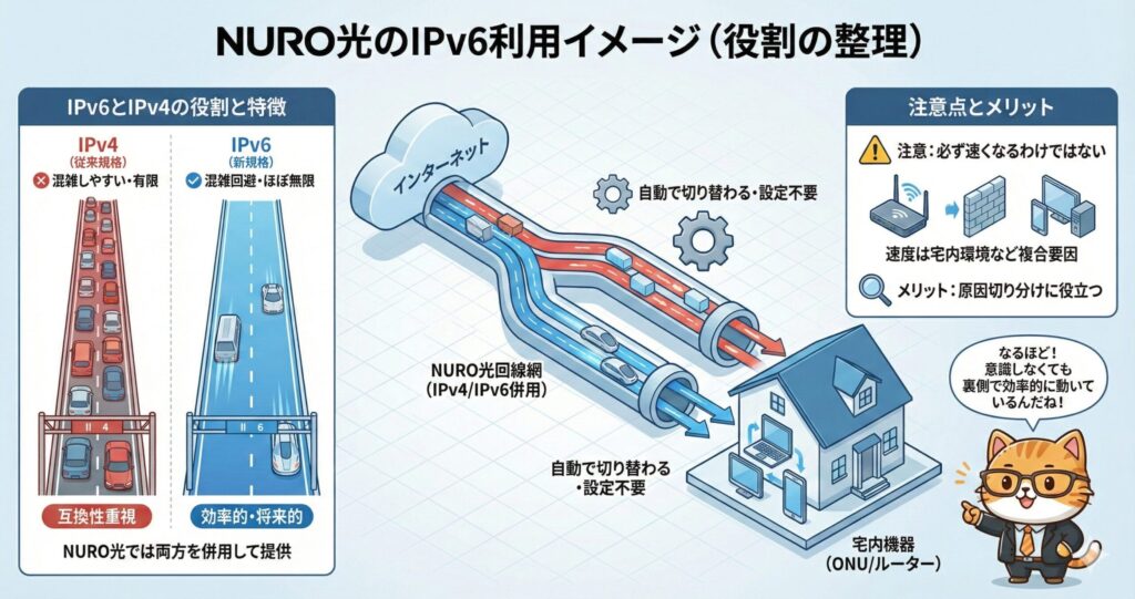 - IPv6の役割とNURO光との関係が整理できる