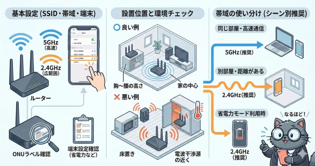 最初に重要なポイントをまとめると、Wi-Fiの最適化は「正しいSSIDを選ぶ」「帯域を使い分ける」「端末側も適切に設定する」という3つが基盤になります。